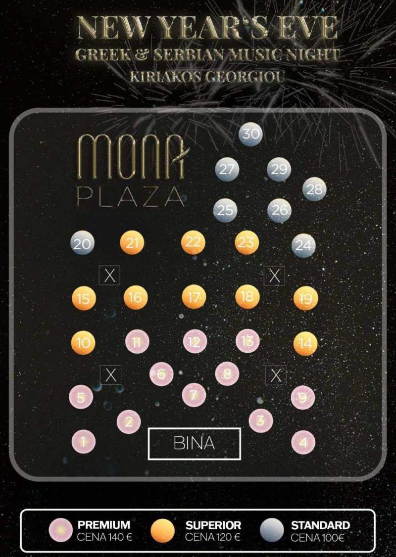 Cena za Novu godinu u hotelu Mona Plaza Beograd je od 100€ do 140€, a cena zavisi od pozicije stola (vidi na mapi).