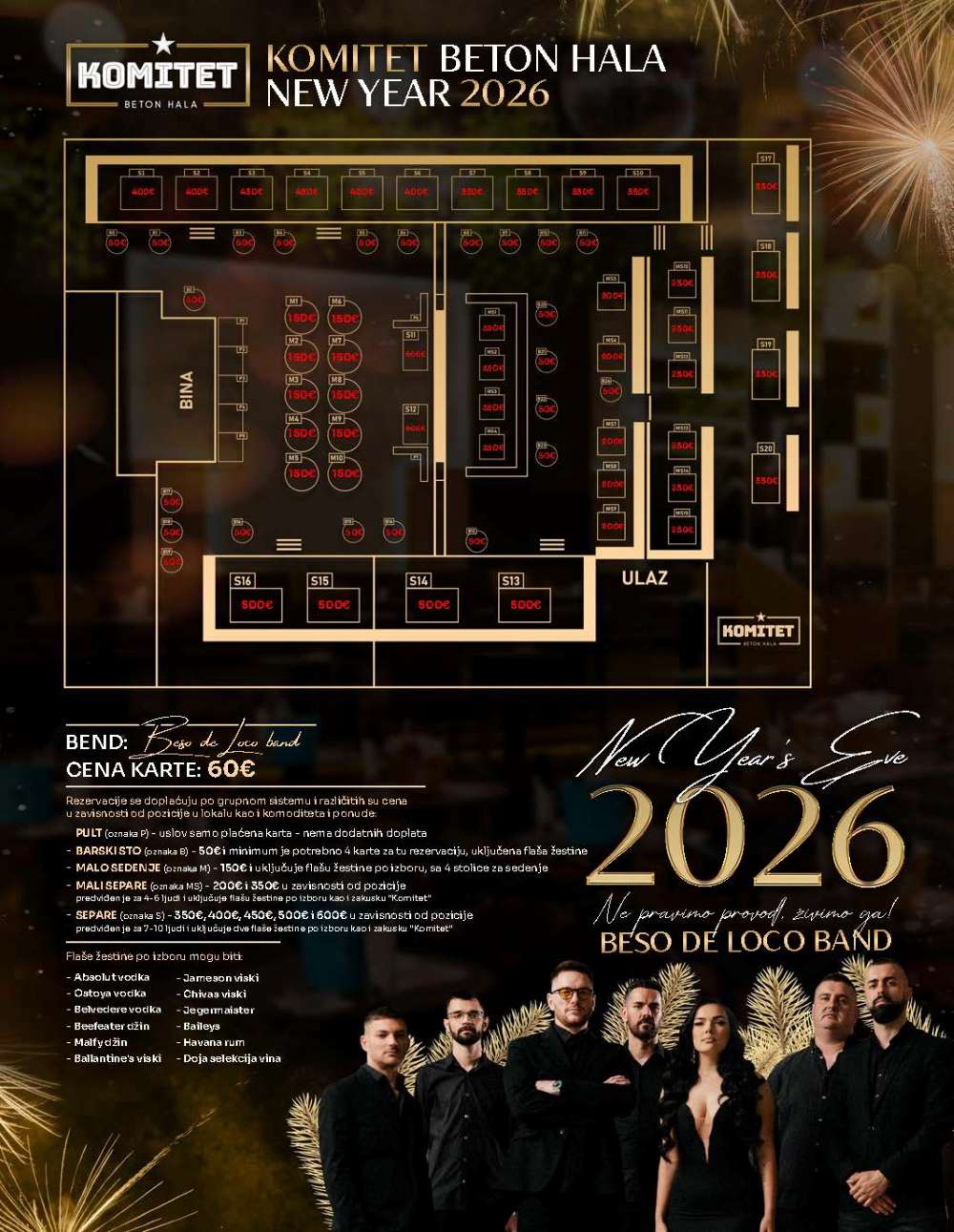 Klub Komitet Nova godina 2026 priuštiće vam, kao i prethodnih godina, nezaboravan doček Nove godine! Dobro poznata energija ovog kluba očekuje vas i ovog puta, u istom raspoloženju, uz specijalan muzički odabir! Beso de Loco bend je tu da napravi pravu magiju, zato se dobro pripremite za senzacionalno veče prepuno iznenađenja!