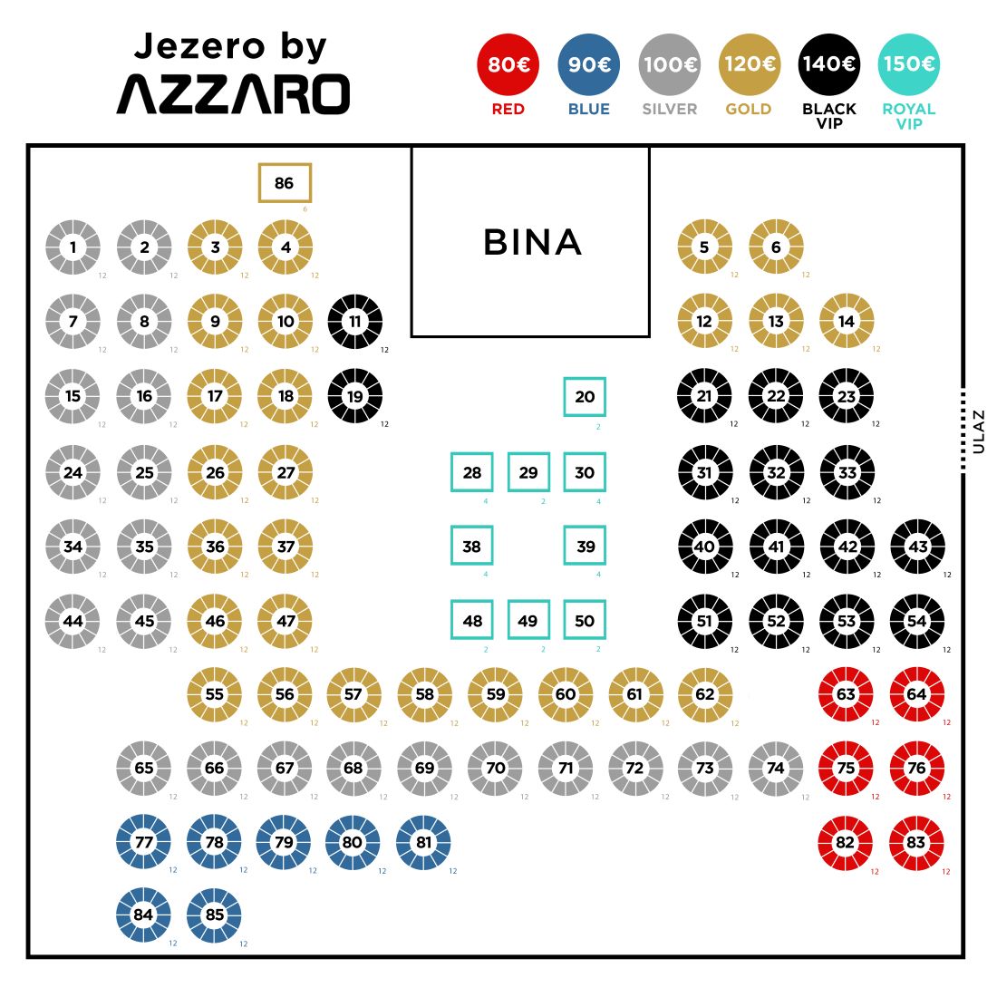 Cena po osobi se kreće od 80€ do 150€ u zavisnosti od pozicije stola u samoj sali (videti na mapi sedenja ispod) i uključuje elegantno mesto za sedenje, svečanu večeru na bazi set menija i all inclusive ponudu pića tokom cele večeri.