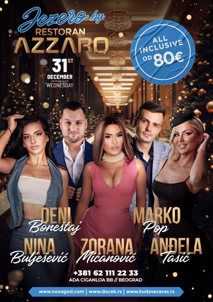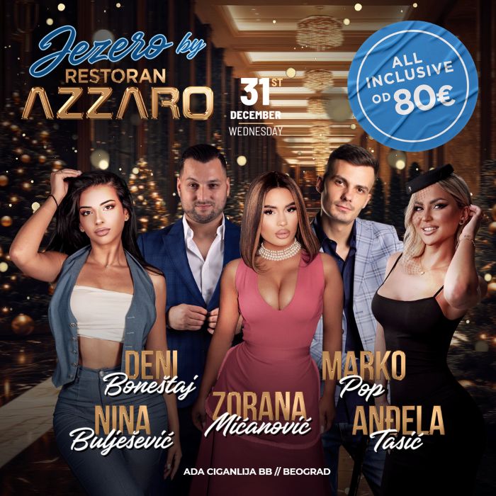Kao i svakog predhodnog, i ovog puta Jezero by Azzaro organizuje neverovatnu novogodišnju proslavu koju će predvoditi fantastična muzička ekipa - Zorana Mićanović, Deni Boneštaj, Anđela Tasić, Marko Pop i Nina Bulješević.