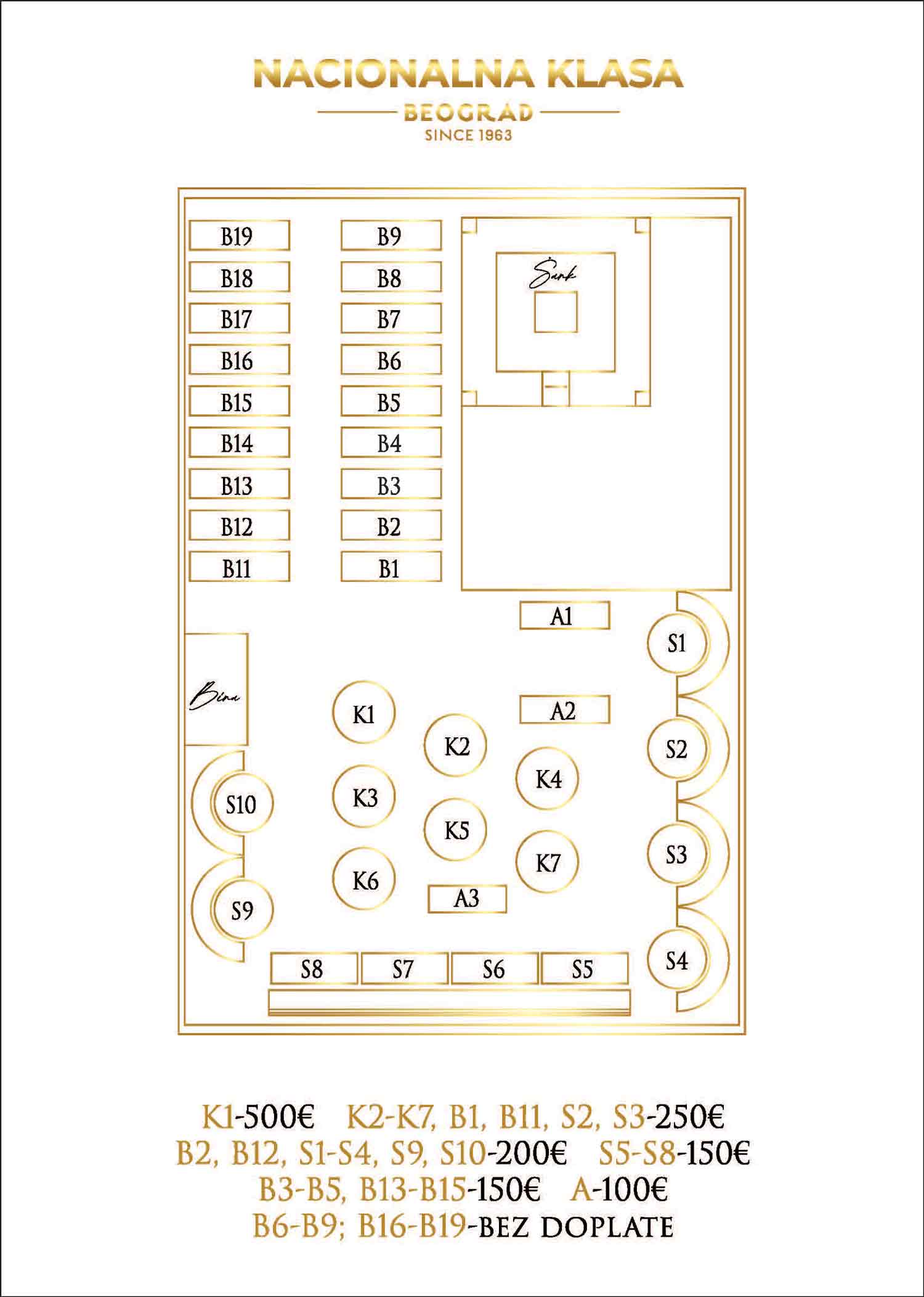 -Stolovi sa oznakama B1, B11, S2, S3 i od K2 do K7 su 250€